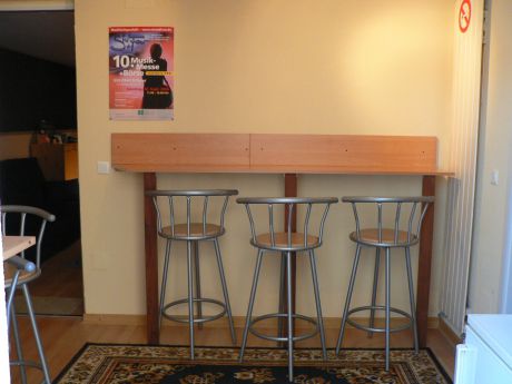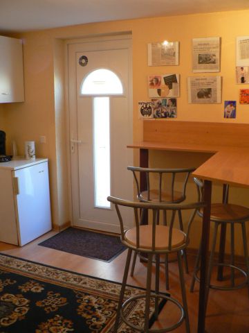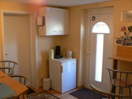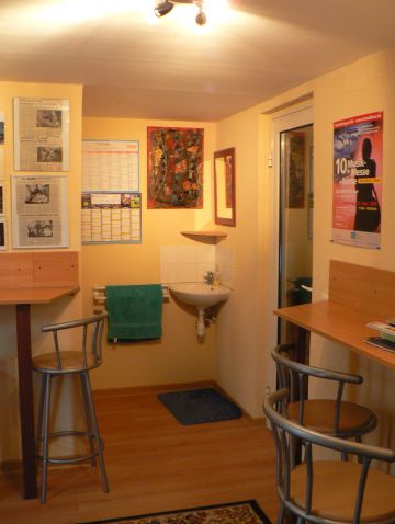 Un espace détente lumineux et insonorisé vous acceuillera dans une ambiance chaleureuse. Vous y dégusterez cafés et autres petites collations. On y trouve également un point d'eau et des toilettes. De cette pièce vous aurez directement accès à l'exterieur du studio.