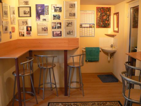 Un espace détente lumineux et insonorisé vous acceuillera dans une ambiance chaleureuse. Vous y dégusterez cafés et autres petites collations. On y trouve également un point d'eau et des toilettes. De cette pièce vous aurez directement accès à l'exterieur du studio.